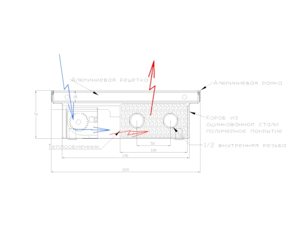 Встраиваемые конвекторы отопления itermic trench blower low profile - это конвекторы встраиваемые в пол с принудительной конвекцией и уменьшенной высотой короба.Ультракомпактный корпус из оцинкованной стали с полимерным покрытием имеет высоту от 70 миллиметров что позволяет монтировать конвектор не только в полы небольшой высоты но и в подоконники и столешницы. В версии 125 мм установлен теплообменник с увеличенной теплоотдачей.