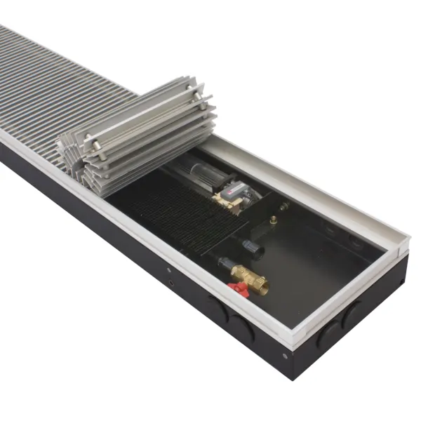Встраиваемые конвекторы отопления itermic trench blower low profile - это конвекторы встраиваемые в пол с принудительной конвекцией и уменьшенной высотой короба.Ультракомпактный корпус из оцинкованной стали с полимерным покрытием имеет высоту от 70 миллиметров что позволяет монтировать конвектор не только в полы небольшой высоты но и в подоконники и столешницы. В версии 125 мм установлен теплообменник с увеличенной теплоотдачей.